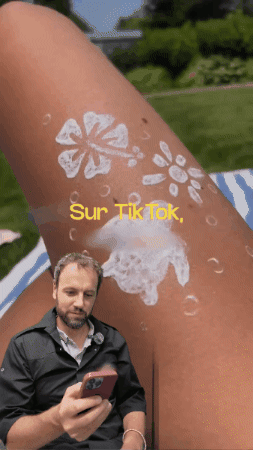 Tout est parti d’un phénomène TikTok, apparu juste avant l’été : les sun tattoos. On se trace des motifs avec de la crème solaire, on s’expose, et la peau marque. En voyant cette trend se propager sur les réseaux, on a choisi d’agir aux côtés de Savéol !